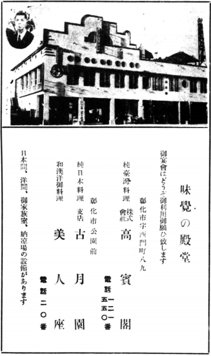 高賓閣建於1938年日本時代,距彰化火車站僅五分鐘路程。建築採現代主義風格,不對稱牆體和圓形窗框,像一艘蒸汽船,在當時相當前衛。據說創辦人王冰淇是受到大稻埕著名飯店江山樓的啟發,回到彰化後蓋了一座接待文人雅士的台式餐廳。